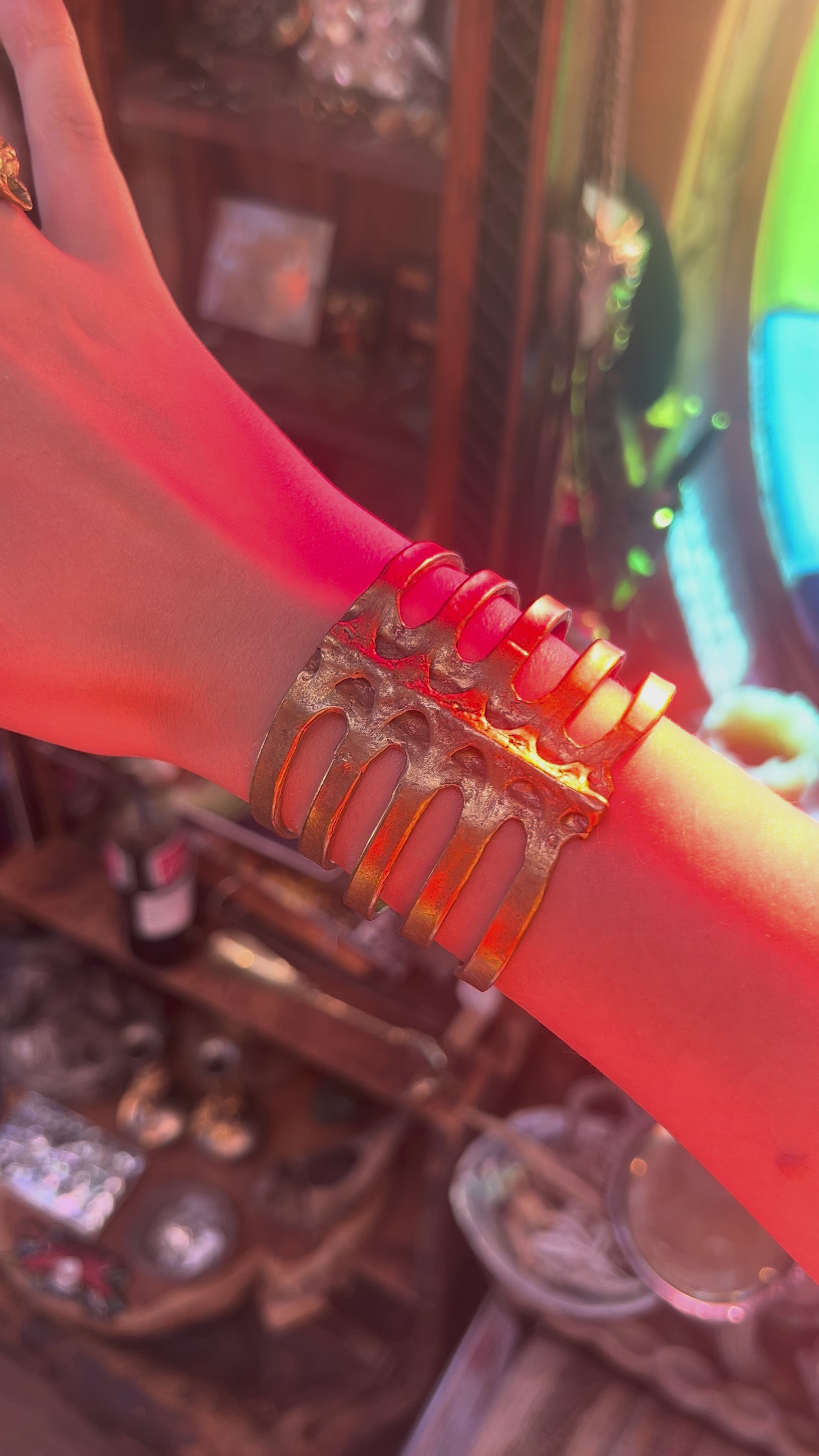 Crafted from our signature reclaimed metal blend of copper and zinc—with zero nickel, lead, or plating—this cuff holds a warm, earthy energy. While slightly malleable, it is solid and structured, meant to feel like a protective shell around your wrist—resilient, rooted, and symbolic.