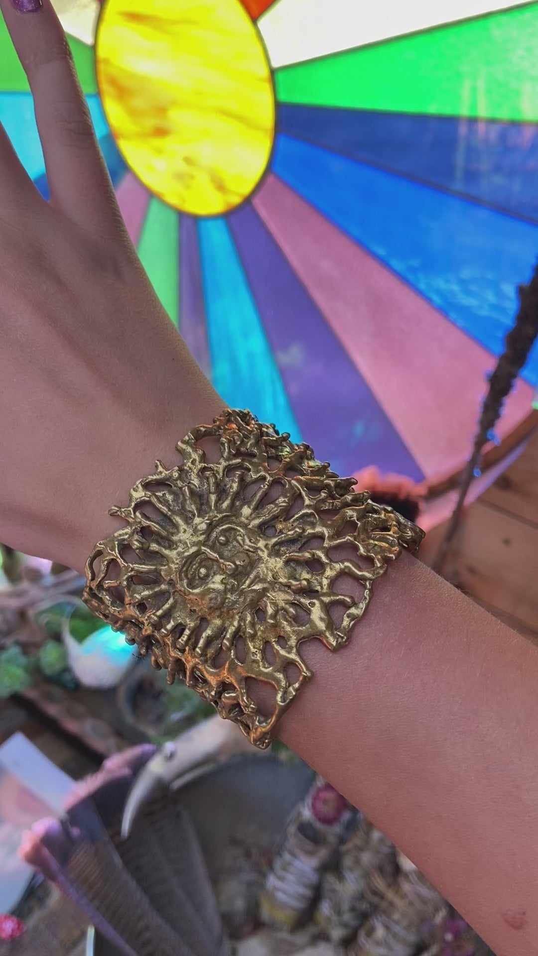 This radiant power piece features an organic sun face at its center, with wild, flowing rays that wrap around the wrist in an embrace of warmth and light. The shapes are raw and untamed—like sunlight breaking through clouds, or the heat of a summer day buzzing with life.