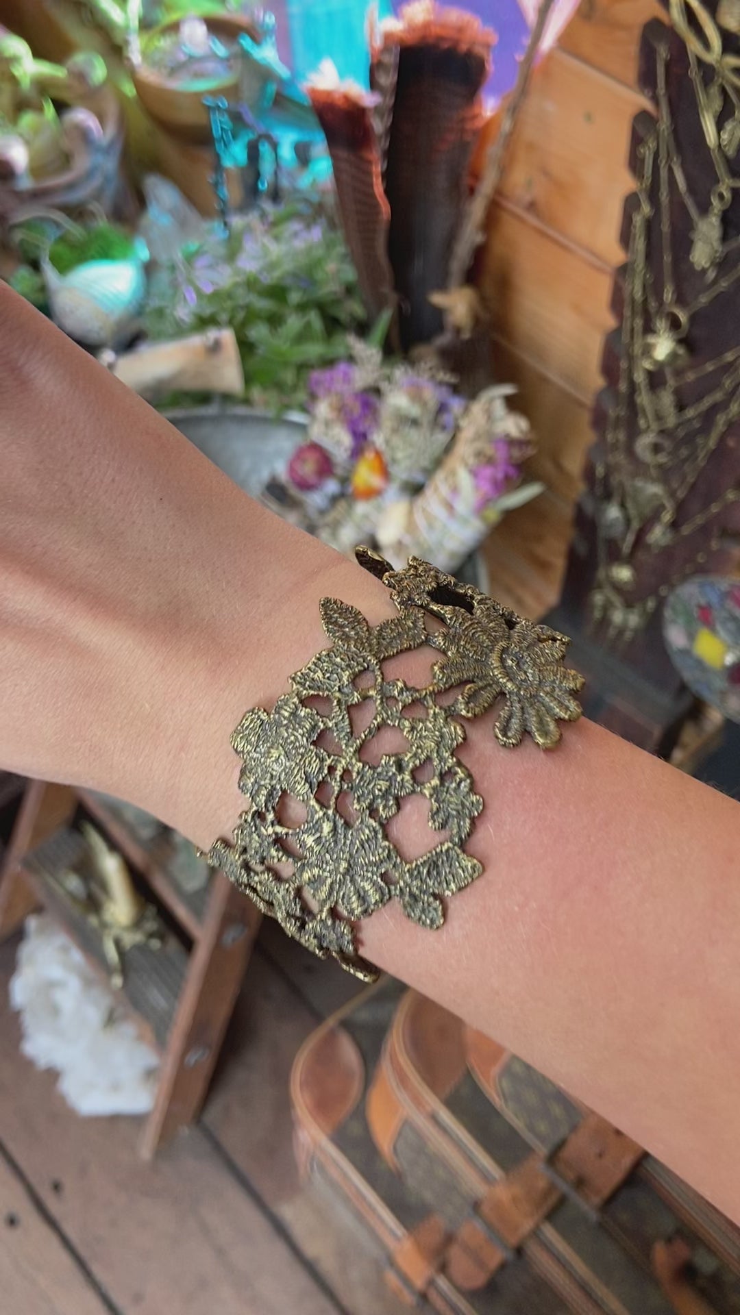 Inspired by heirloom lace from my grandmother’s cherished collection, this delicate cuff captures the timeless beauty of the past. Intricately detailed with flowers and leaves, it gracefully reveals glimpses of skin beneath, appearing as though you’re wearing a piece of lace cast in metal. Crafted from our signature reclaimed metal blend of copper and zinc—zero nickel, lead, or plating—this piece is gently malleable; carefully squeeze it to fit your wrist once, then slide it on and off to preserve its integrity. Honoring the legacy of treasured keepsakes, this cuff is designed to last generations. We proudly stand behind our craftsmanship and will repair any breaks due to workmanship.